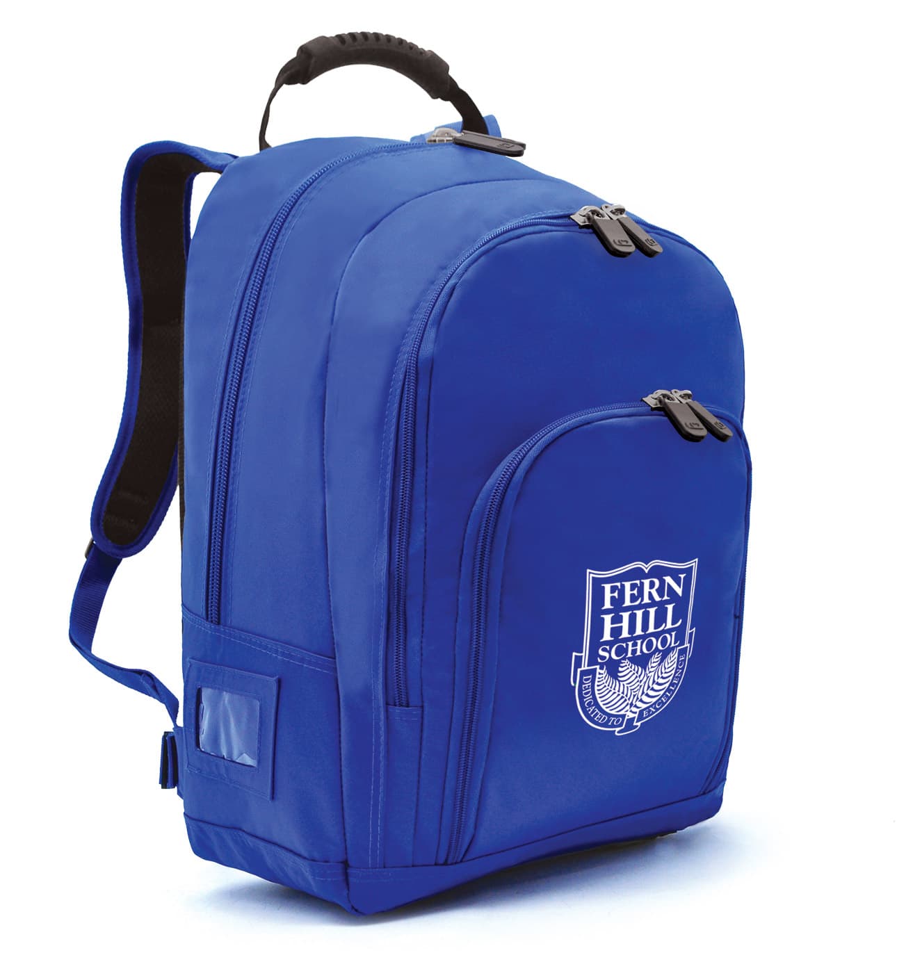 Main compartment with extra large zipper, Second compartment with zipper, One front zippered pocket, One clear ID pocket at the left, One drink Dark Green holder with mesh at the right, Padded and adjustable backpack strap with moulded handle, Extra pad at the back for back support, Waist buckle for support, Studded base for durability