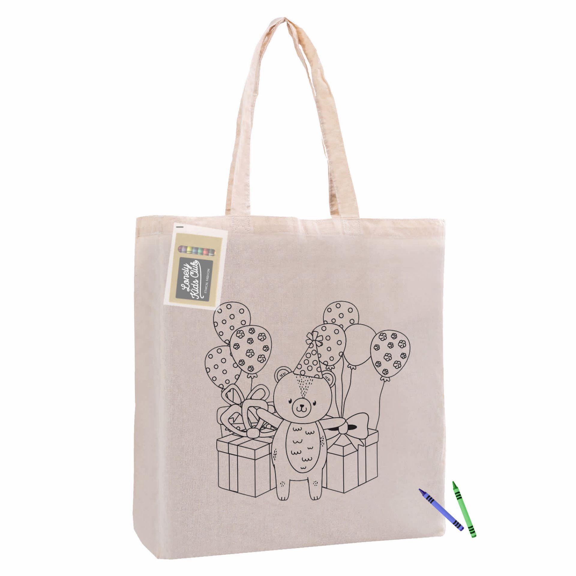 Colour your own custom design character cotton tote bag this tote makes a fun way for kids to use their creativity to colour and decorate the bags. It keeps kids entertained for hours and away from electronic devices. The bag is made of 140gsm echo friendly 100% unbleached natural cotton fabric with gusset comes with 8 assorted non toxic coloured wax crayons packed in a recycled cardboard box which will be packed in a small plastic bag stapled on cotton bag. Crayon Colours Pink Red Orange Yellow Green Blue Purple and Black.