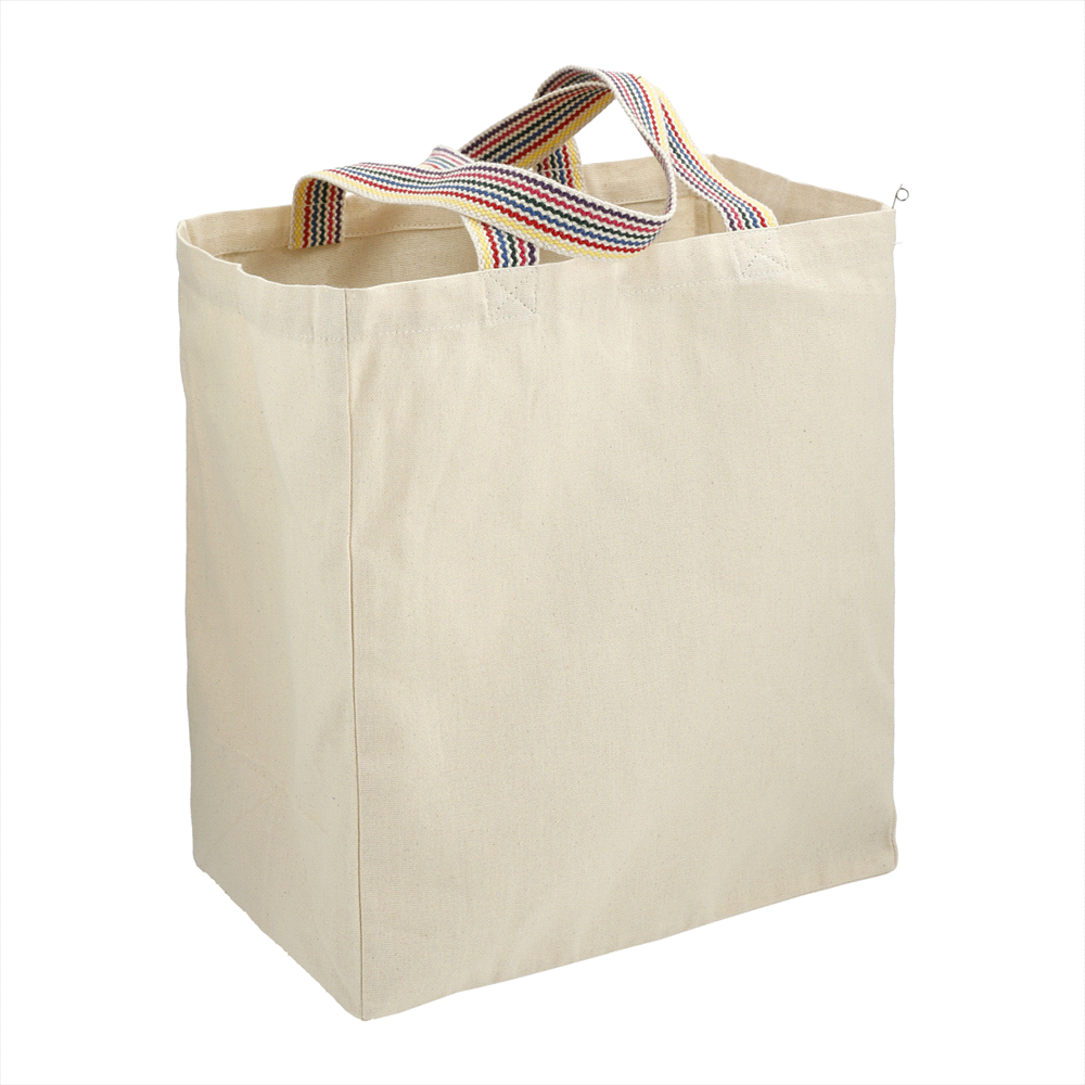 An instant upgrade to the regular cotton grocery tote is the Rainbow Recycled 8oz Cotton Grocery Tote. Made from pre-consumer recycled cotton, this grocery tote features rainbow webbing grab handles, and makes a perfect grab and go bag for the farmer's market or grocery store.
